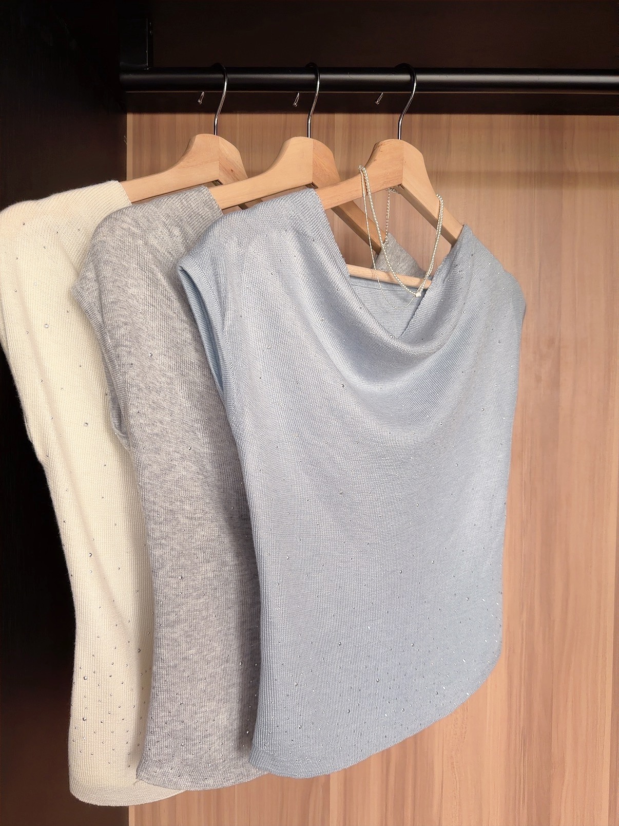 DETAIL: STRECHEABLE, DRAPED COLLAR, RHINESTONE